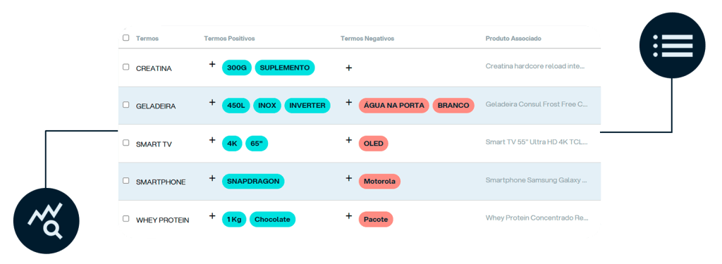 Você define uma lista de termos (ex: “cafeteira inox 3 xícaras”, “sabonete líquido infantil”).