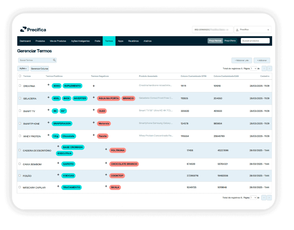 No ambiente dinâmico de marketplaces e e-commerces, a Precifica oferece um recurso complementar: o monitoramento por termos.